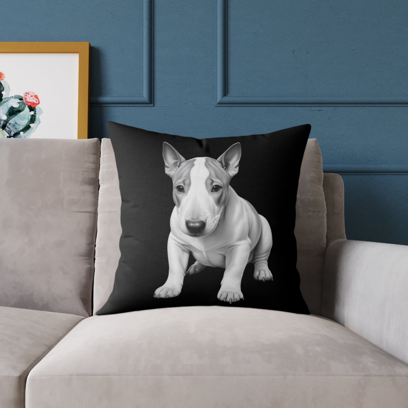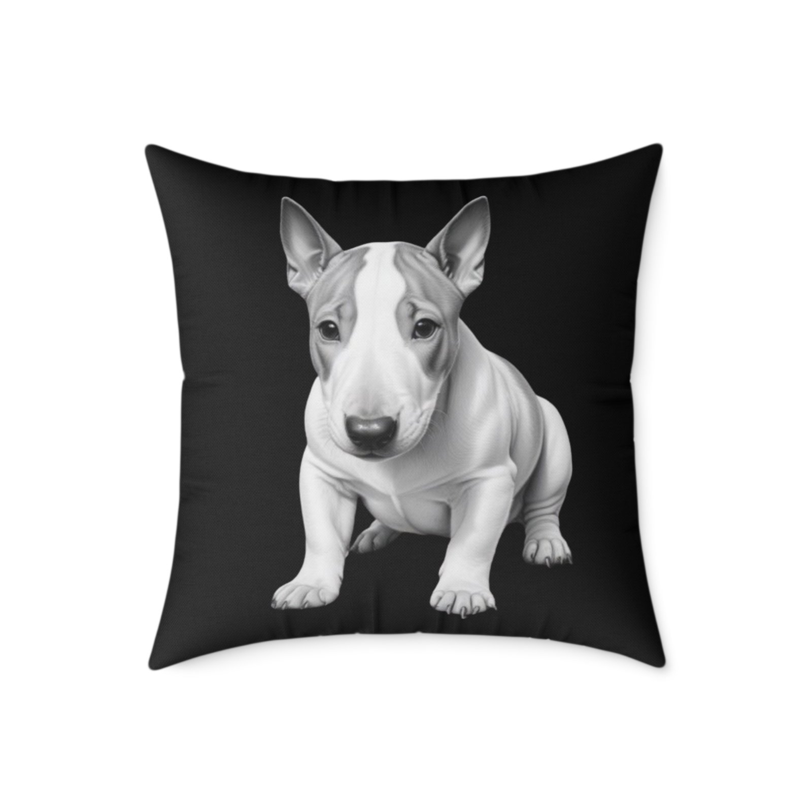 English Bull Terrier. Help uplift any home’s surroundings with customized polyester pillows. Featuring a concealed zipper that doesn’t show, each pillow comes already filled with 100% polyester filling. Add your art and help create unique home decorations that capture the eye of guests and cheer the home owner’s mood.