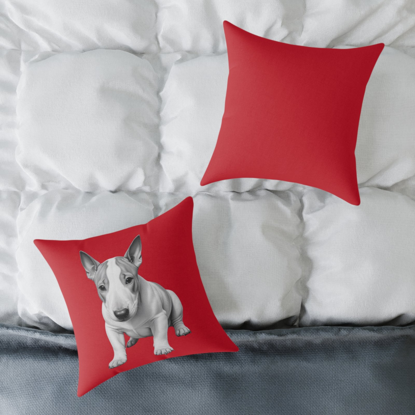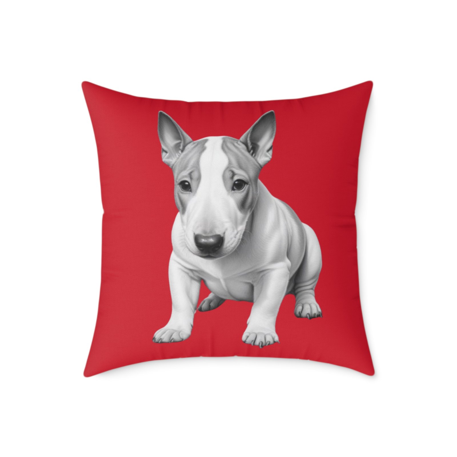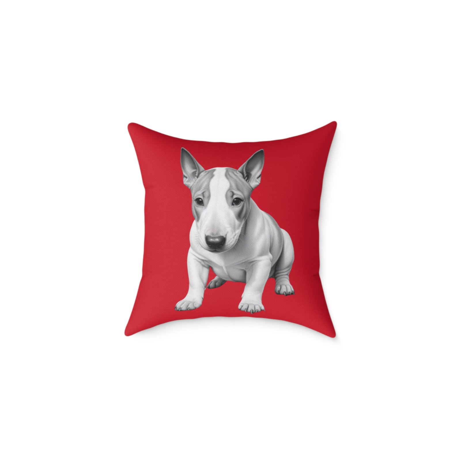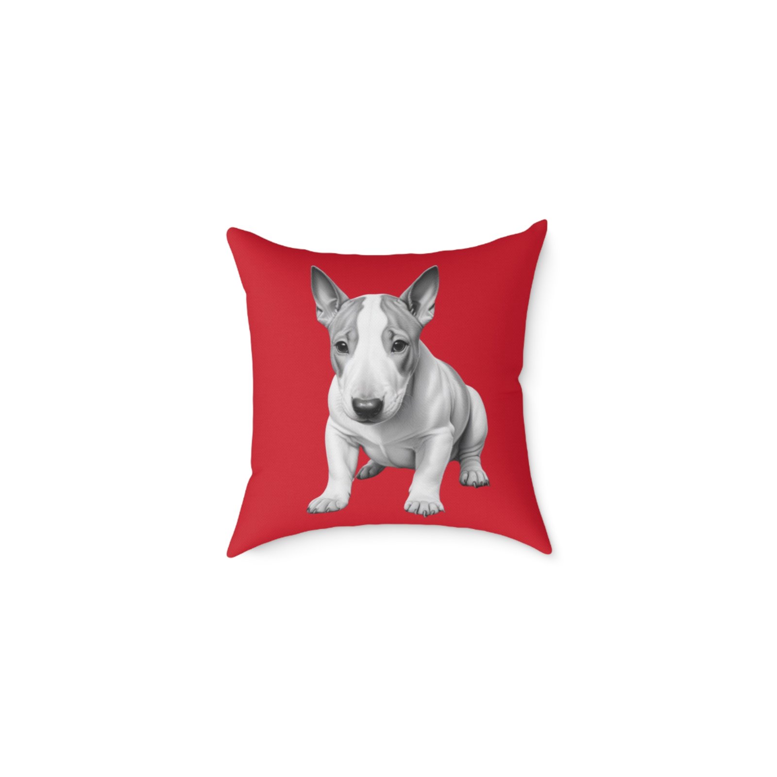 English Bull Terrier. Help uplift any home’s surroundings with customized polyester pillows. Featuring a concealed zipper that doesn’t show, each pillow comes already filled with 100% polyester filling. Add your art and help create unique home decorations that capture the eye of guests and cheer the home owner’s mood.