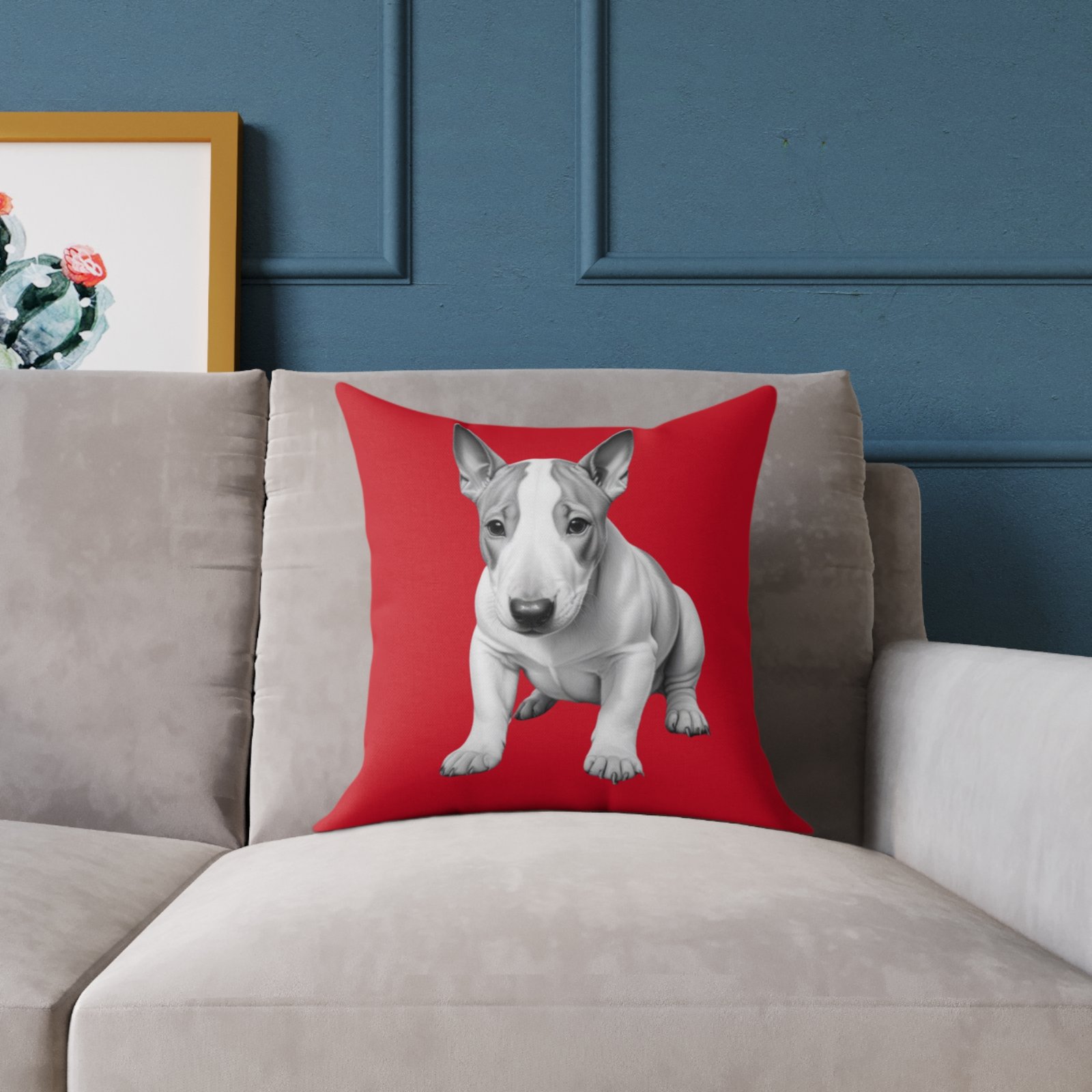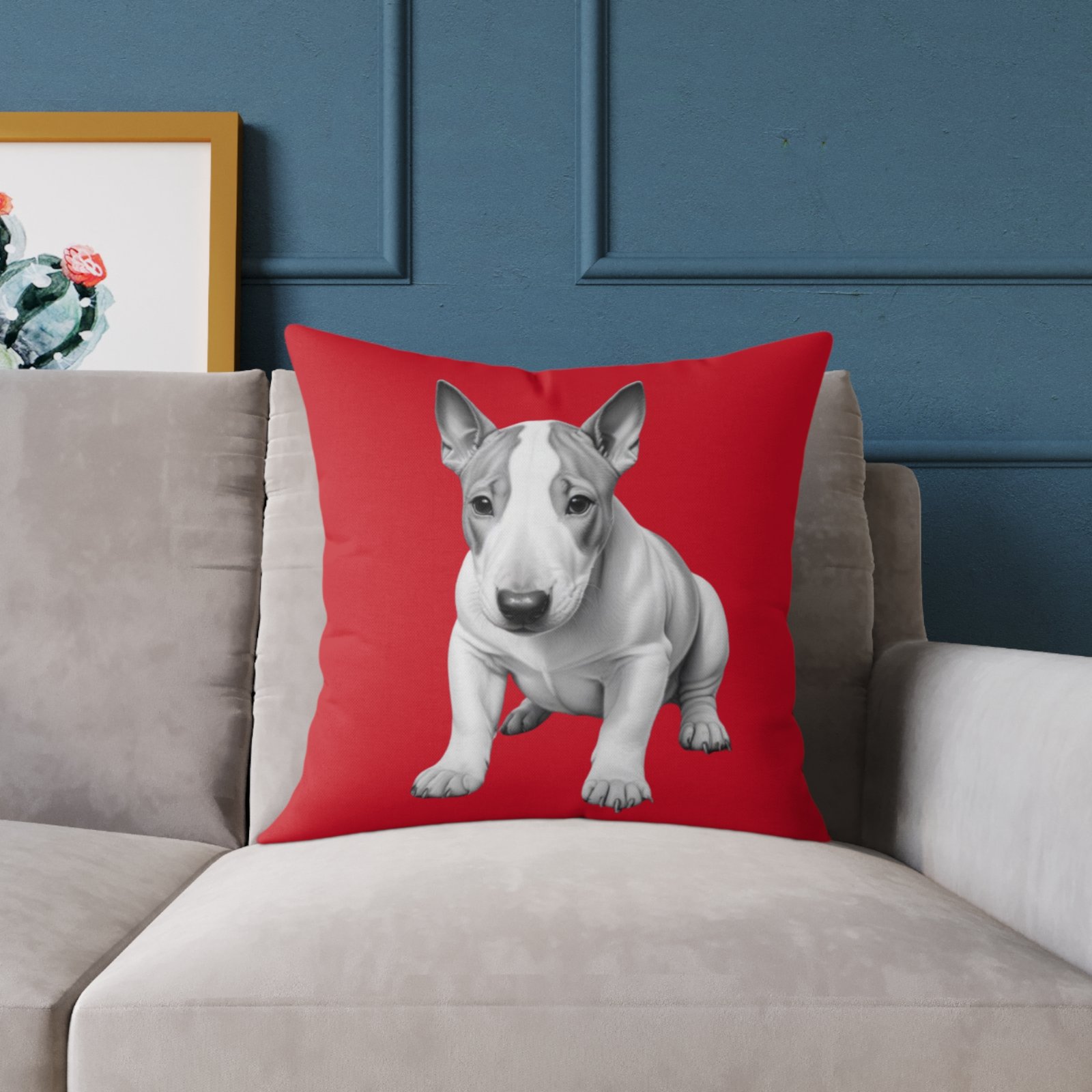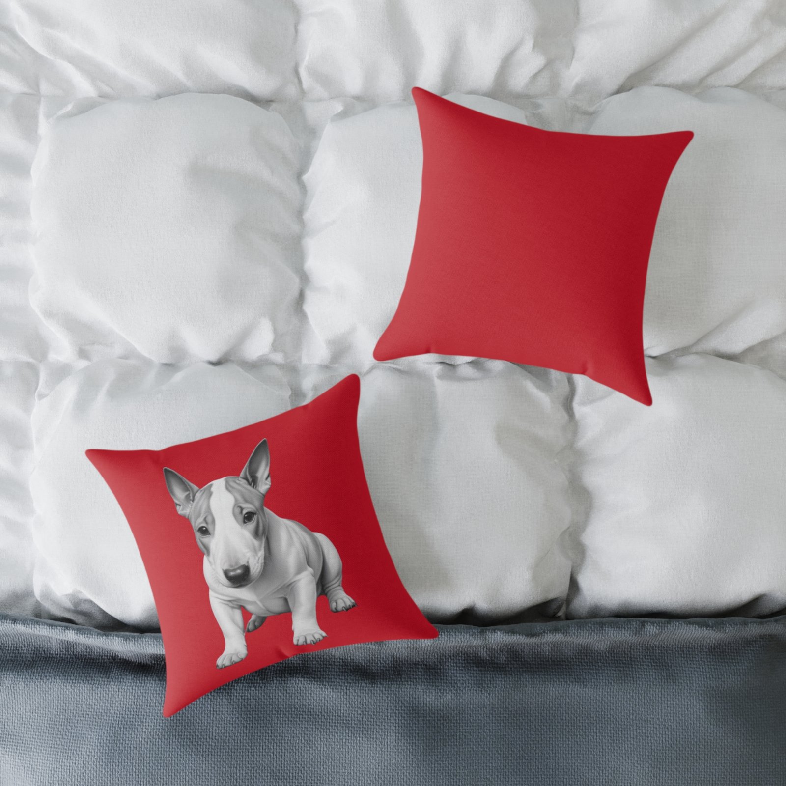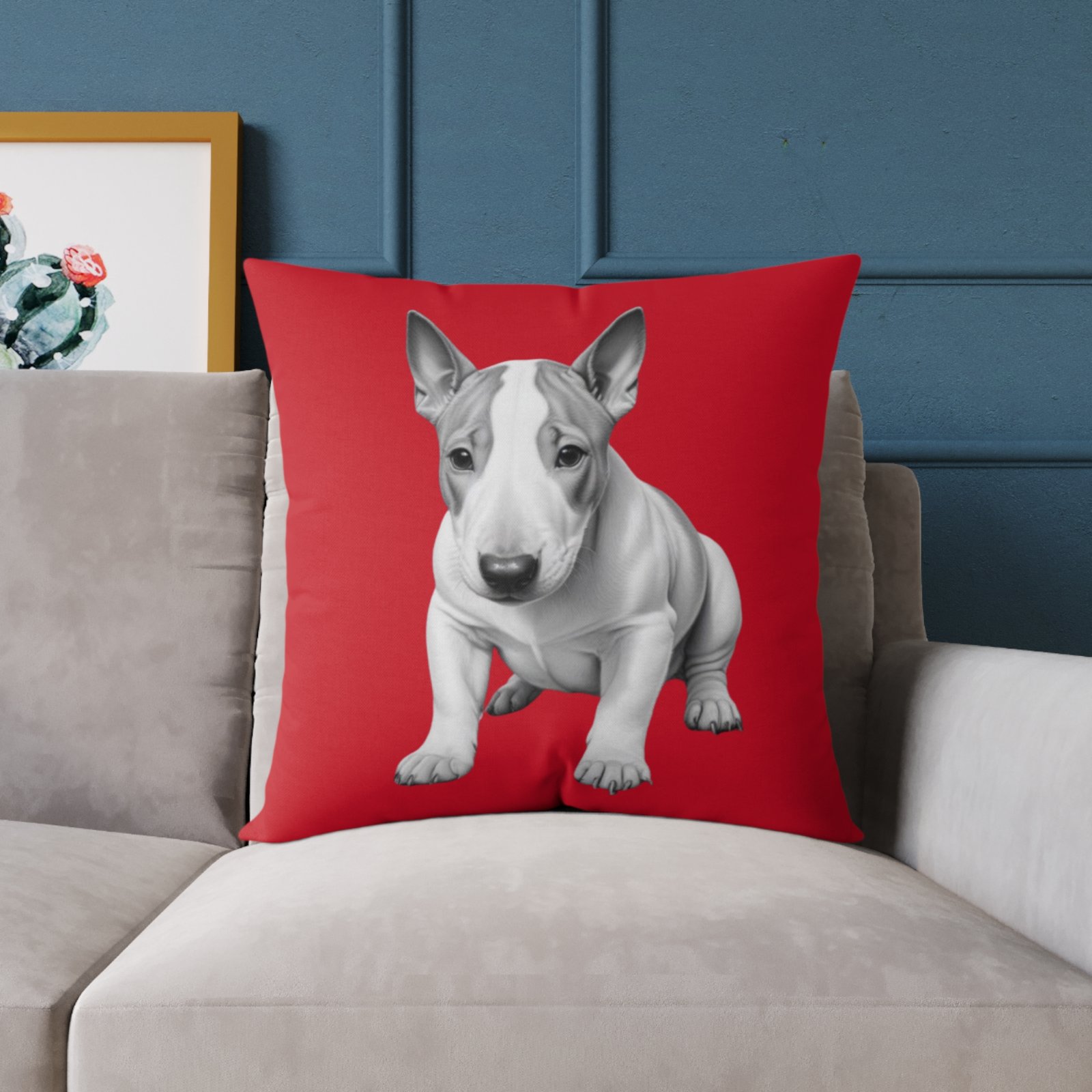 English Bull Terrier. Help uplift any home’s surroundings with customized polyester pillows. Featuring a concealed zipper that doesn’t show, each pillow comes already filled with 100% polyester filling. Add your art and help create unique home decorations that capture the eye of guests and cheer the home owner’s mood.