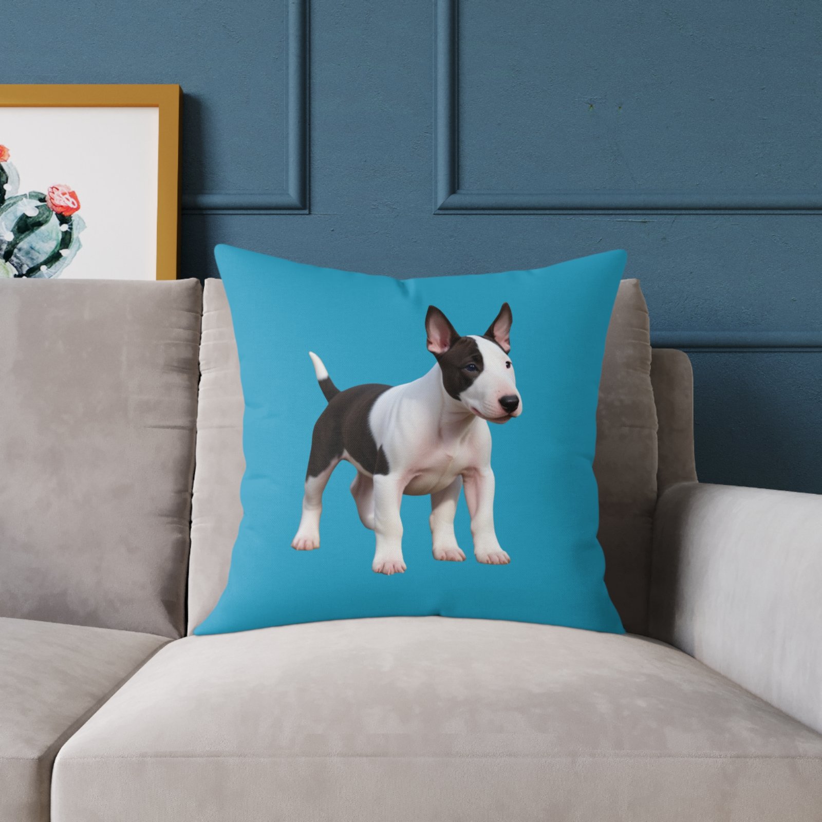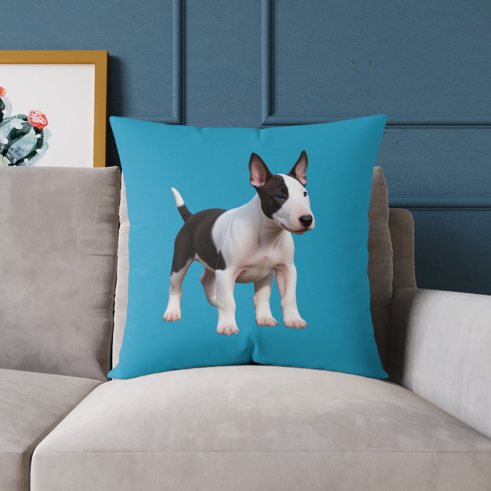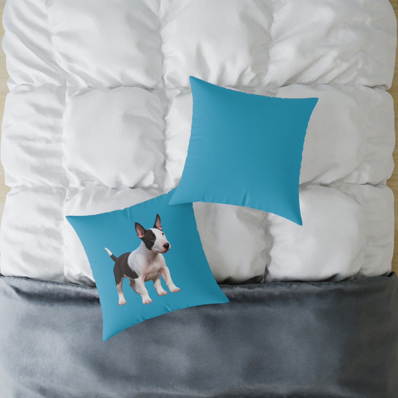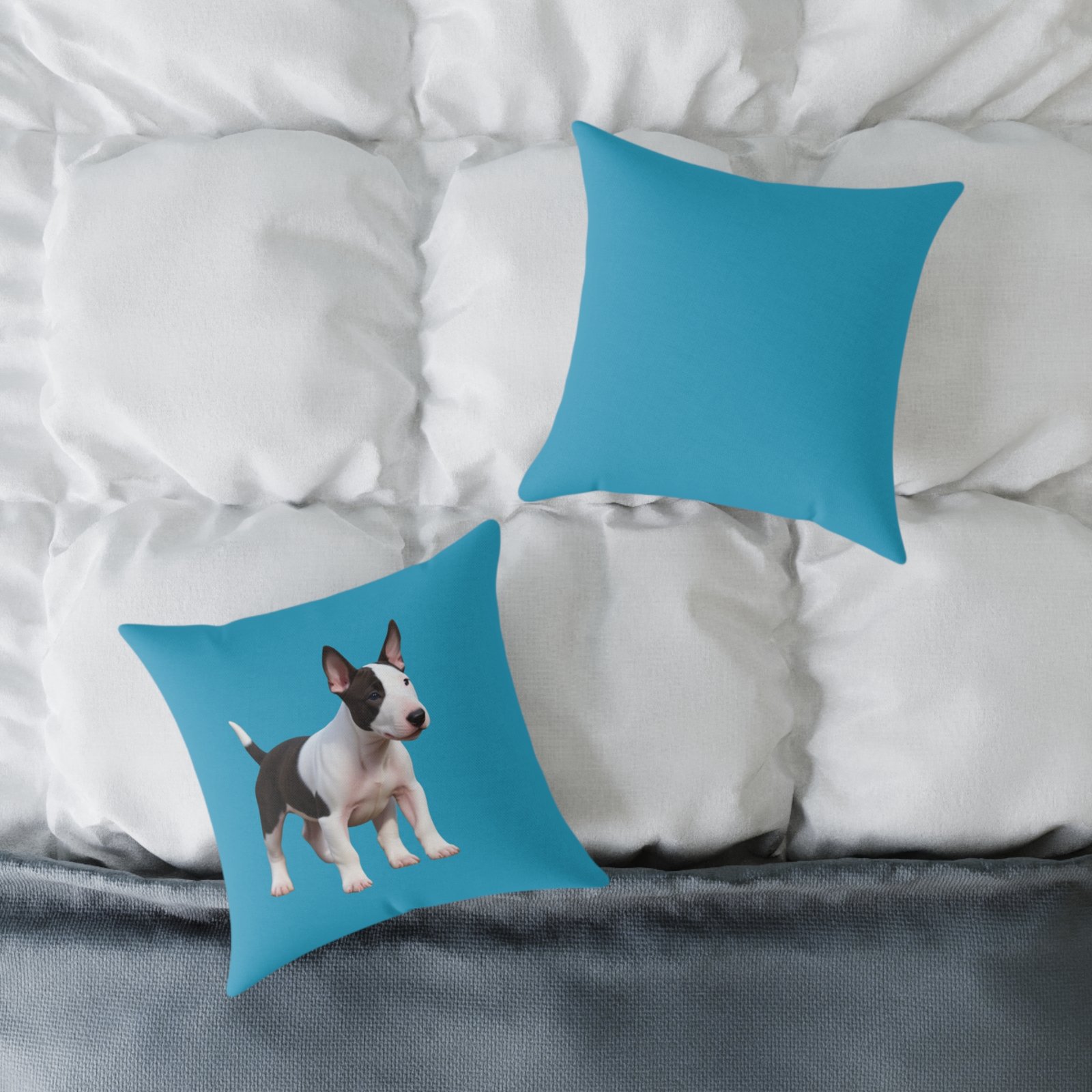 English Bull Terrier. Help uplift any home’s surroundings with customized polyester pillows. Featuring a concealed zipper that doesn’t show, each pillow comes already filled with 100% polyester filling. Add your art and help create unique home decorations that capture the eye of guests and cheer the home owner’s mood.