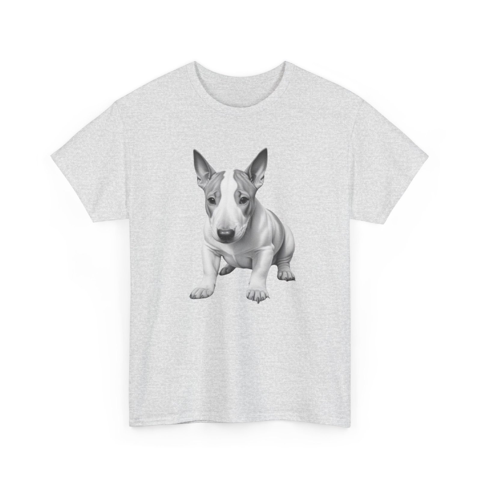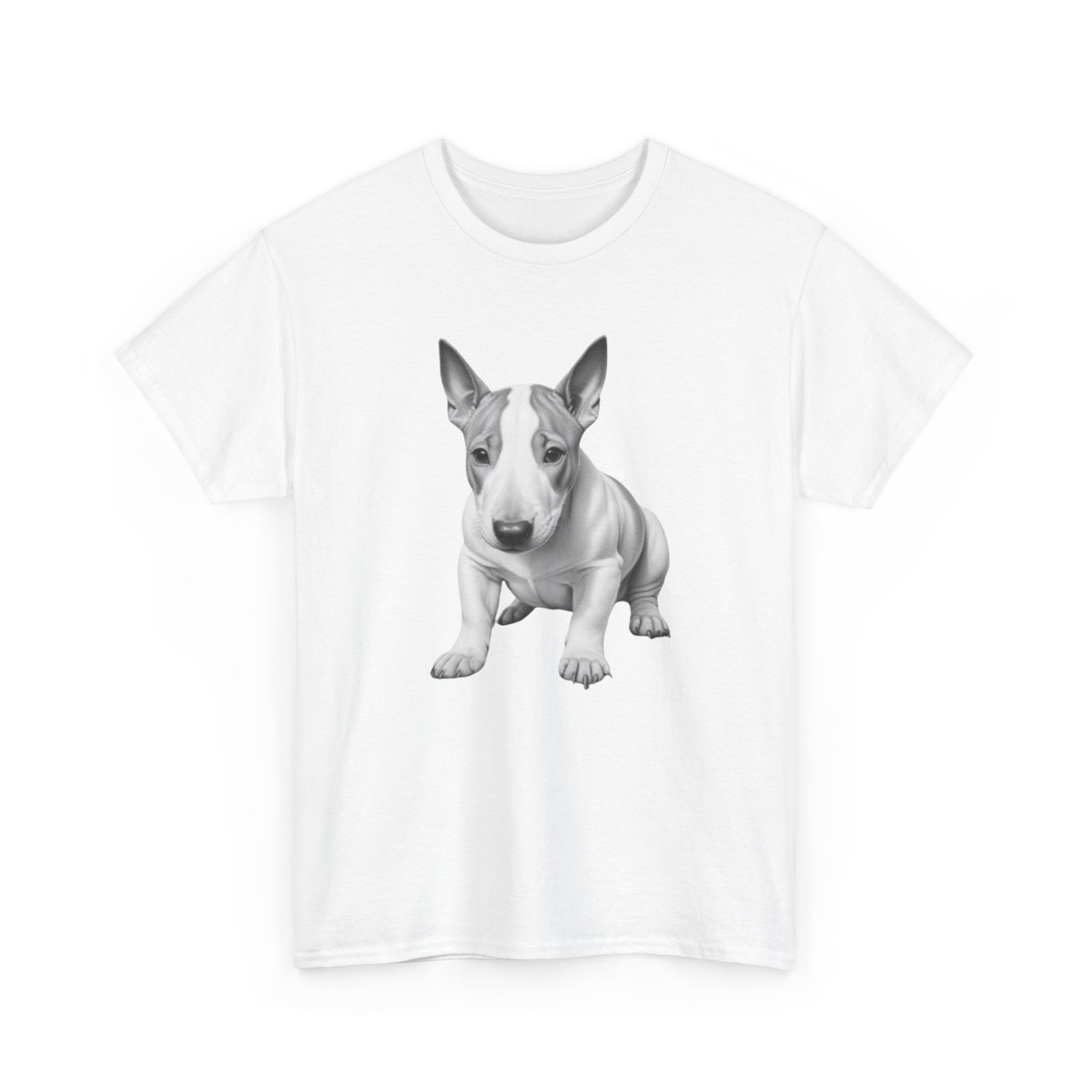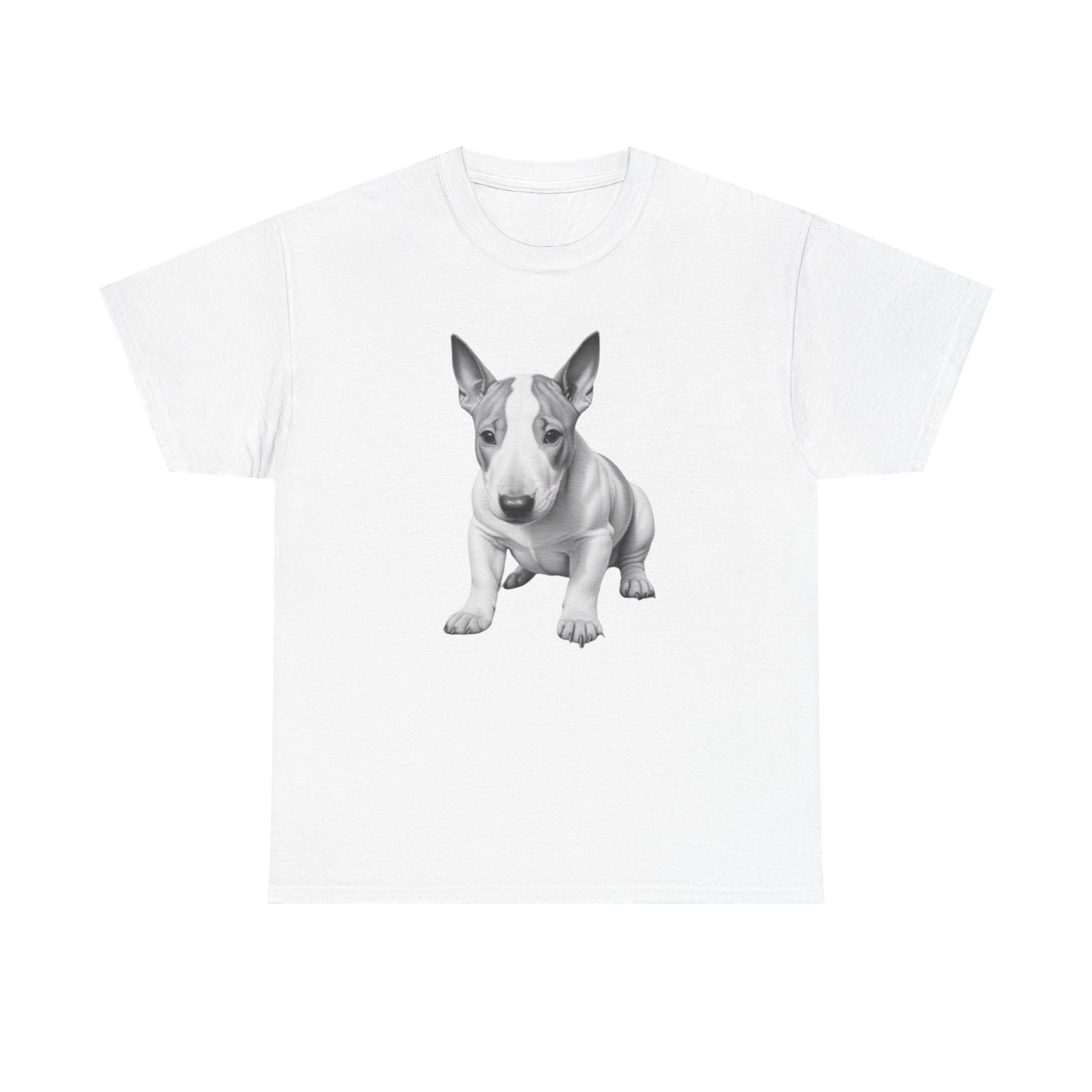English Bull Terrier. The unisex heavy cotton tee is the basic staple of any wardrobe. It is the foundation upon which casual fashion grows. All it needs is a personalized design to elevate things to profitability. The specially spun fibers provide a smooth surface for premium printing vividity and sharpness. No side seams mean there are no itchy interruptions under the arms. The shoulders have tape for improved durability.