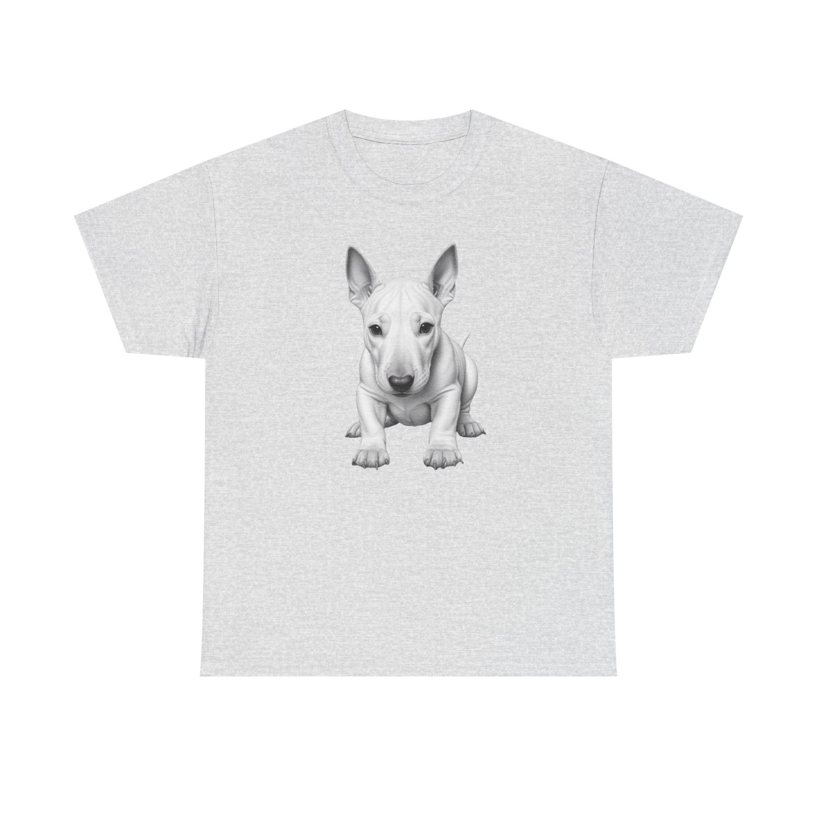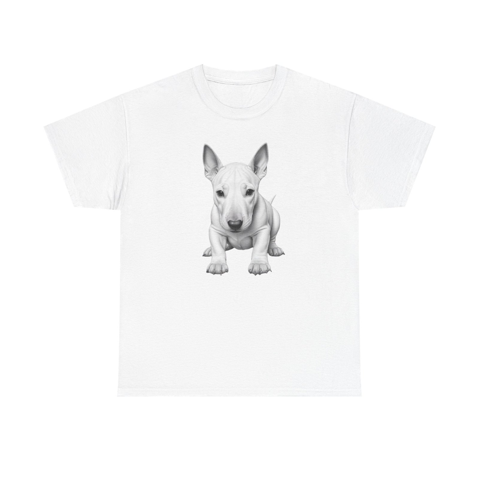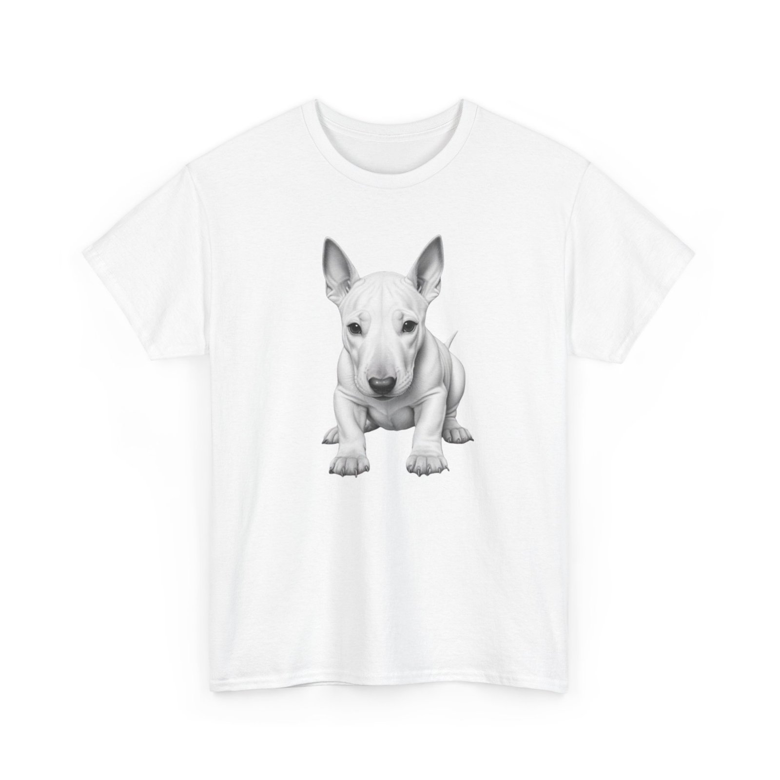 English Bull Terrier. The unisex heavy cotton tee is the basic staple of any wardrobe. It is the foundation upon which casual fashion grows. All it needs is a personalized design to elevate things to profitability. The specially spun fibers provide a smooth surface for premium printing vividity and sharpness. No side seams mean there are no itchy interruptions under the arms. The shoulders have tape for improved durability.