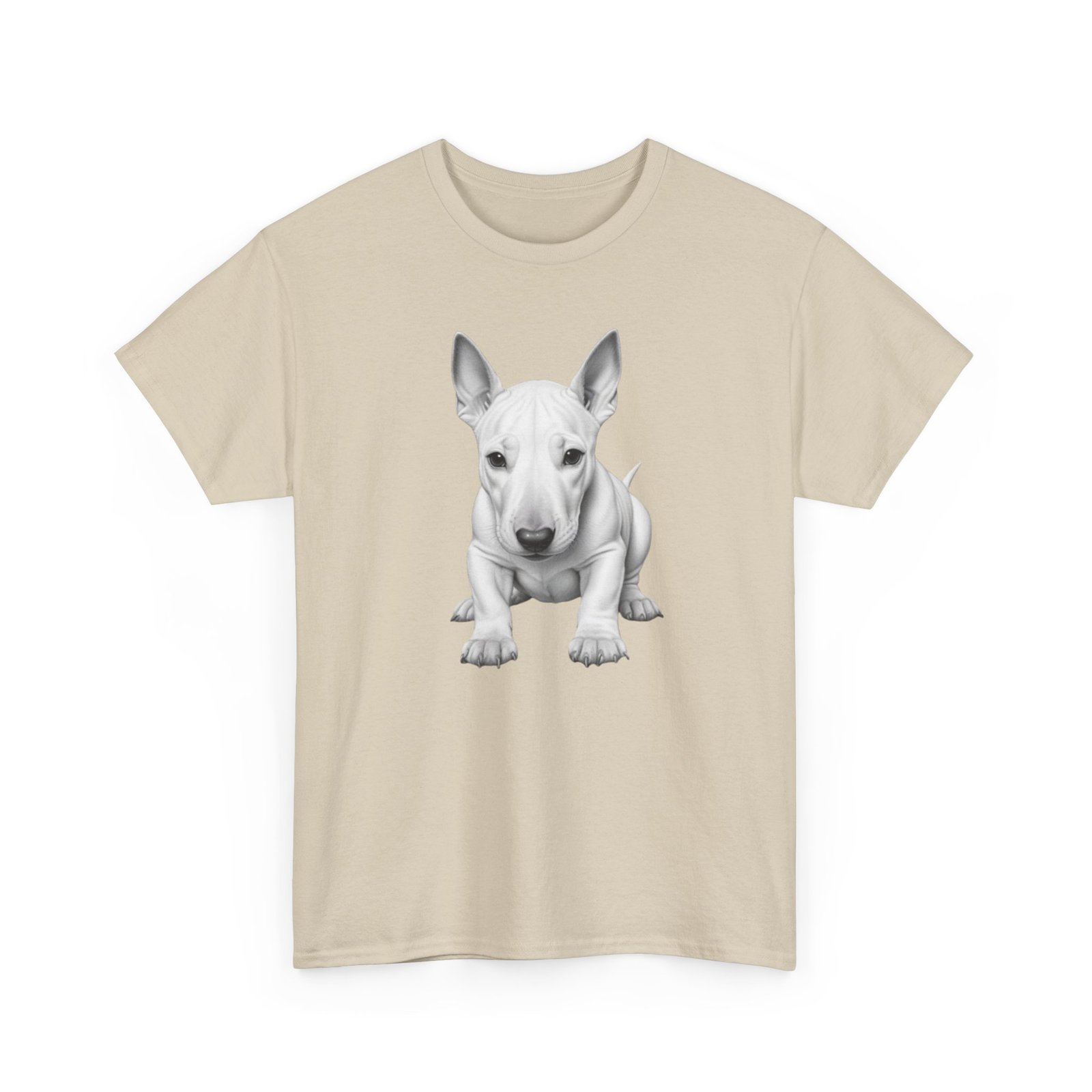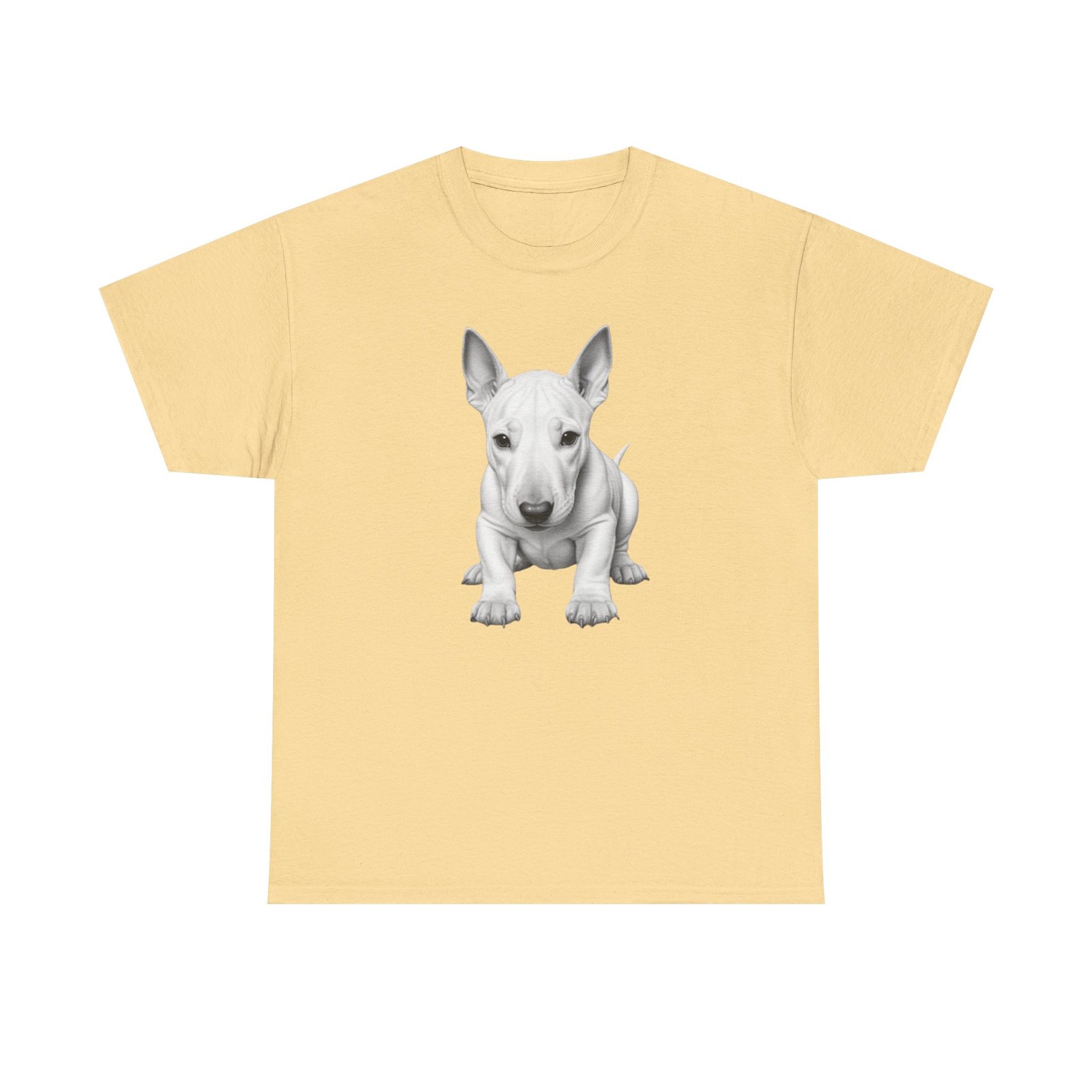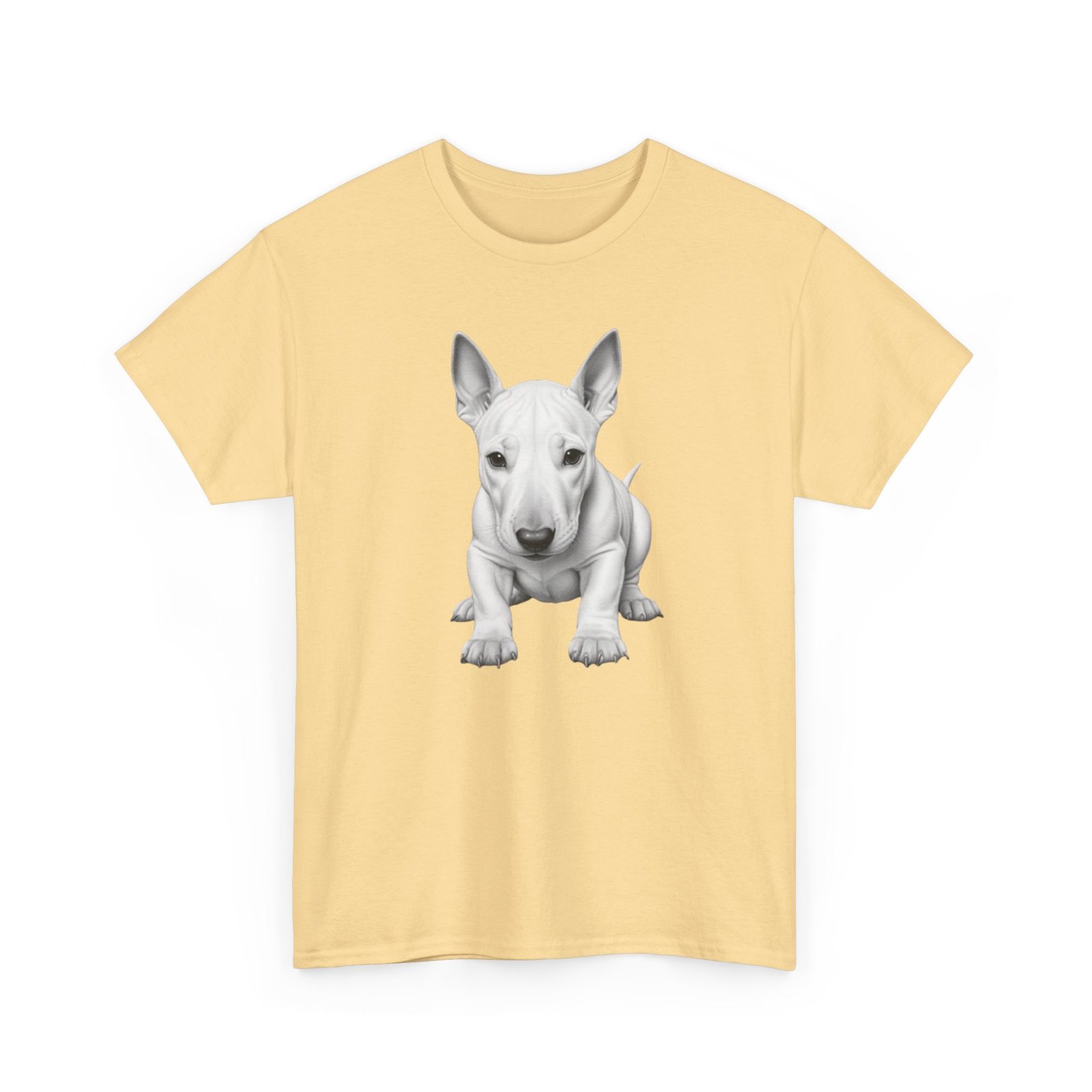 English Bull Terrier. The unisex heavy cotton tee is the basic staple of any wardrobe. It is the foundation upon which casual fashion grows. All it needs is a personalized design to elevate things to profitability. The specially spun fibers provide a smooth surface for premium printing vividity and sharpness. No side seams mean there are no itchy interruptions under the arms. The shoulders have tape for improved durability.