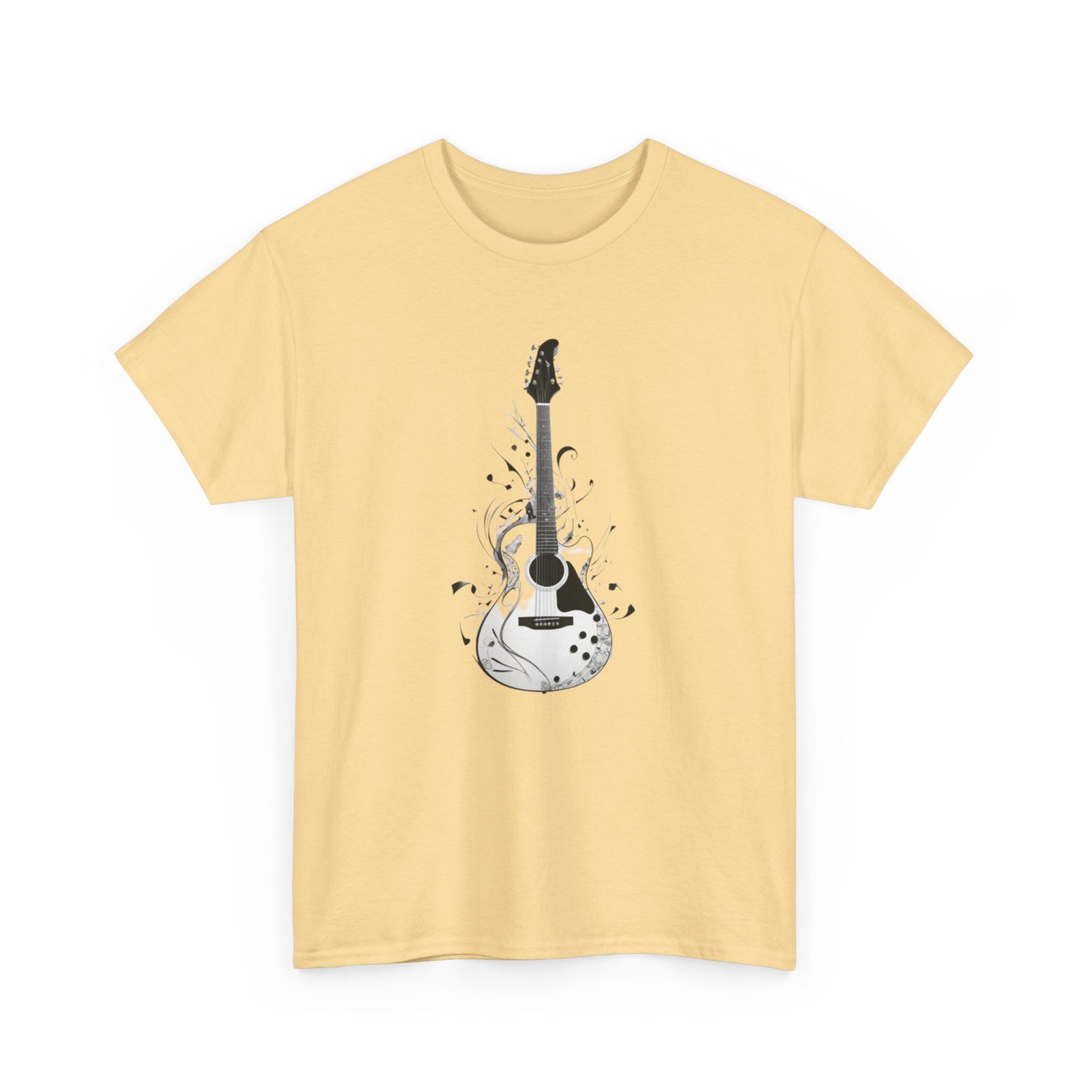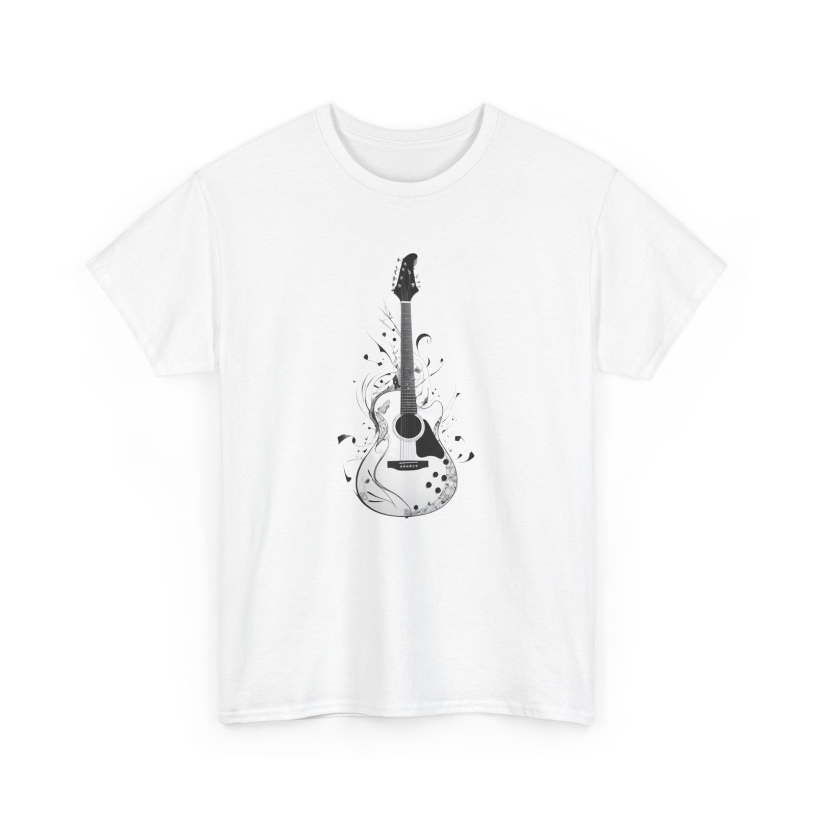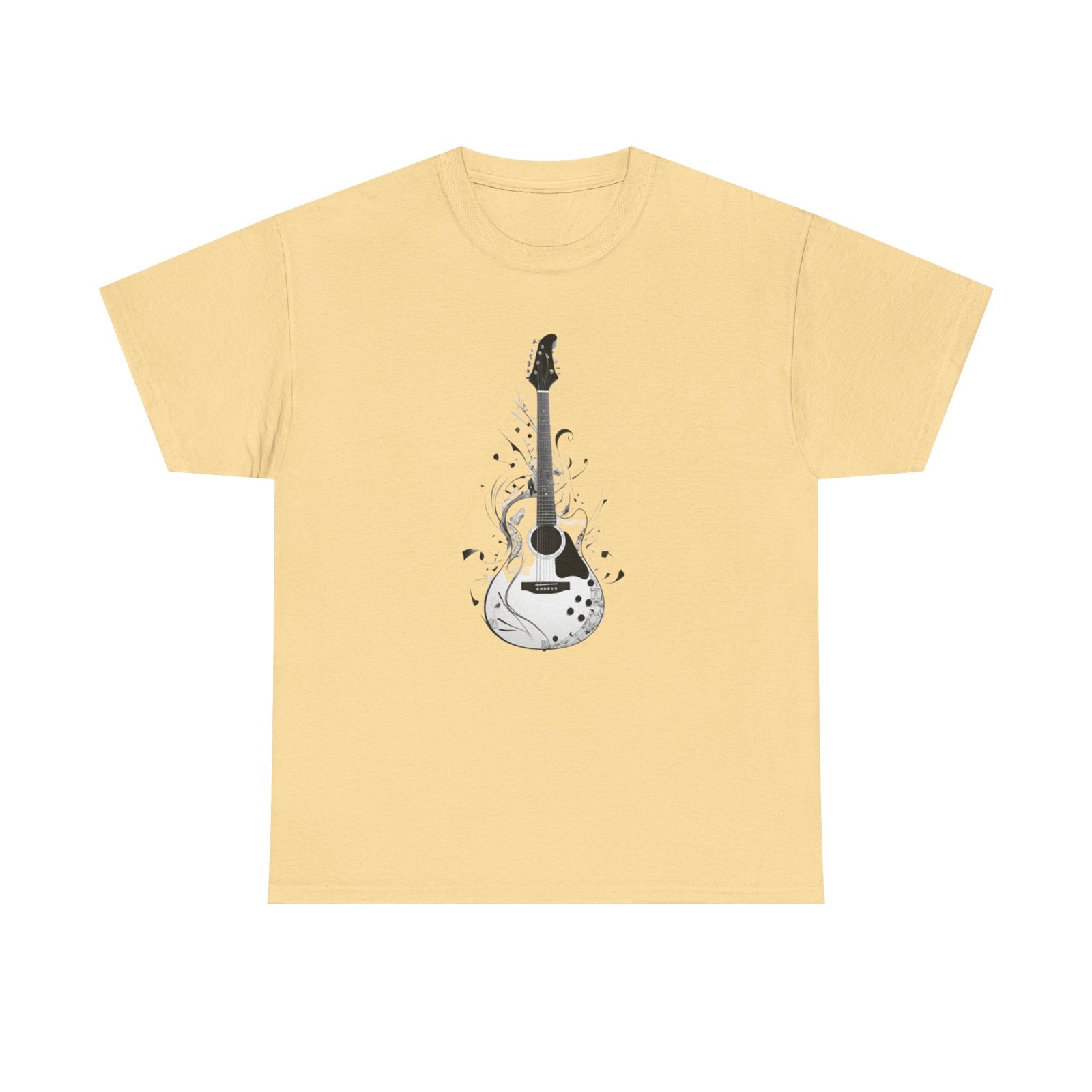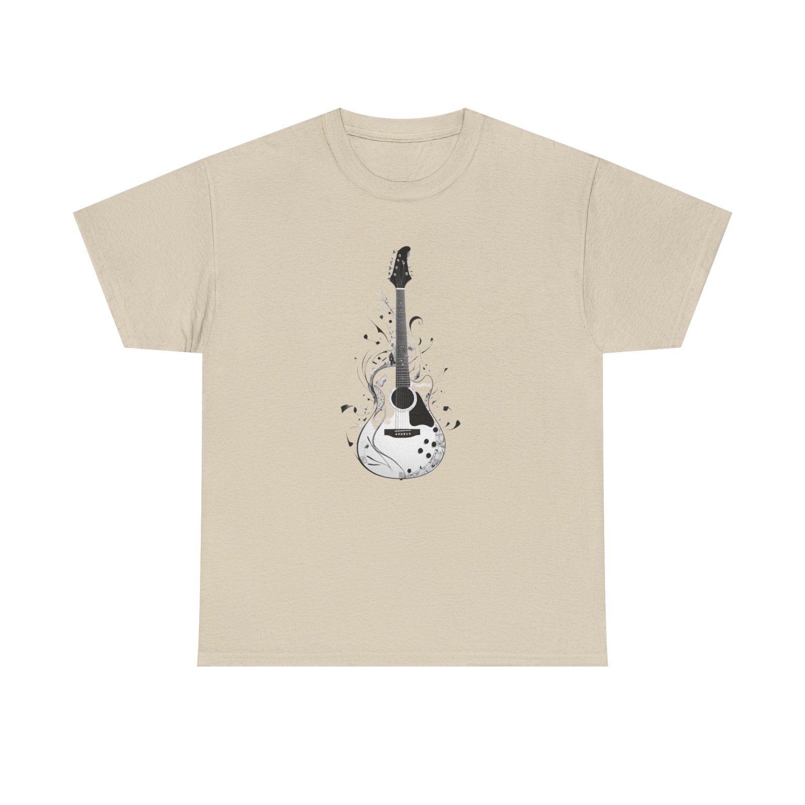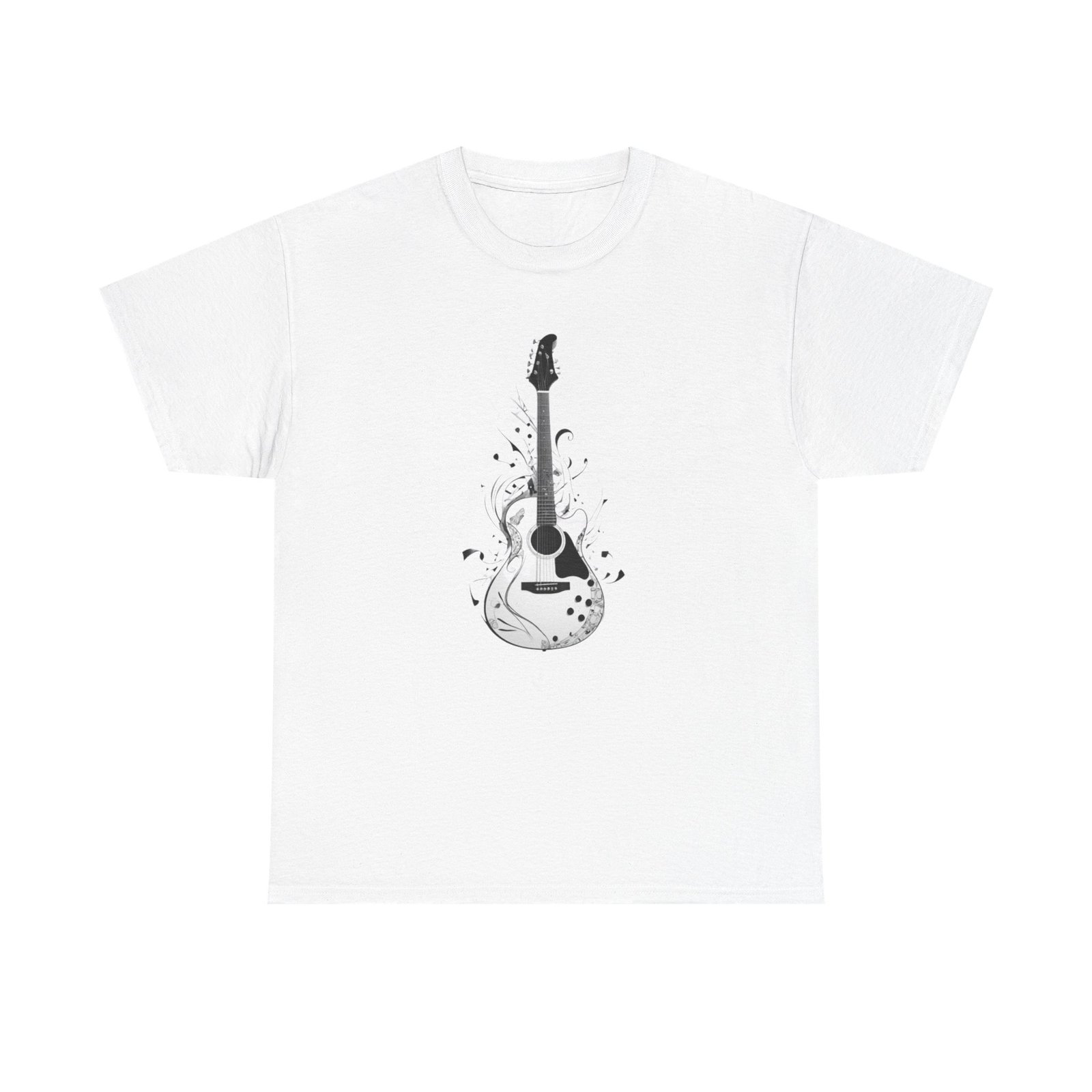 Guitar Music T- shirt The unisex heavy cotton tee is the basic staple of any wardrobe. It is the foundation upon which casual fashion grows. All it needs is a personalized design to elevate things to profitability. The specially spun fibers provide a smooth surface for premium printing vividity and sharpness. No side seams mean there are no itchy interruptions under the arms. The shoulders have tape for improved durability.