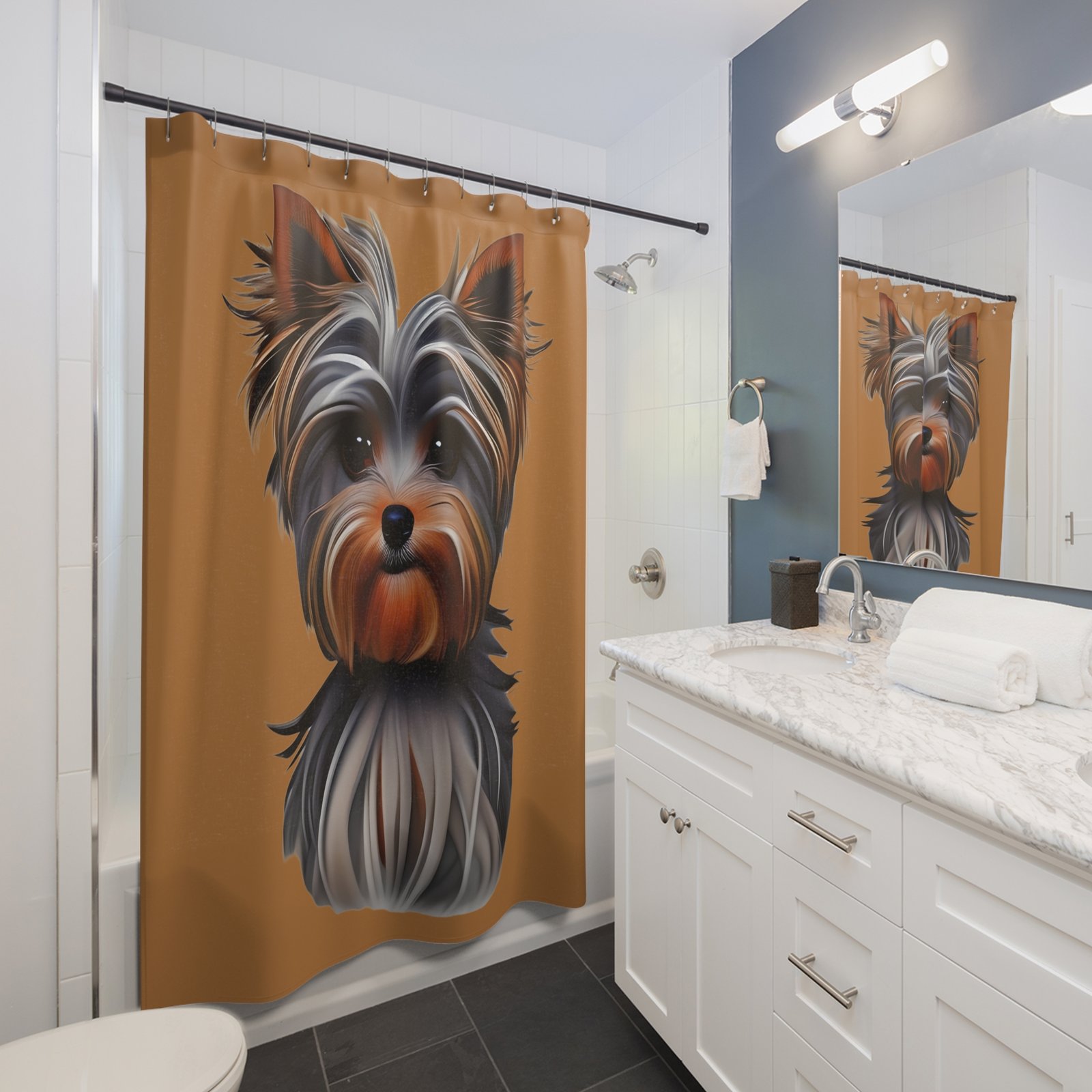 This shower curtain is perfect for Terrier dog lovers and canine pet enthusiasts. It adds a fun and playful touch to any bathroom, creating a cozy and welcoming atmosphere. Ideal for adults who enjoy furry friends as part of their decor. Great for holidays like National Dog Day or for everyday use.